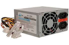 | Fuente de alimentación, con los diferentes conectores: - El de 24 pines es el que conecta a la placa base - Los de 4 pines conectan con unidades ópticas - El de 8 pines conecta con la tarjeta gráfica |